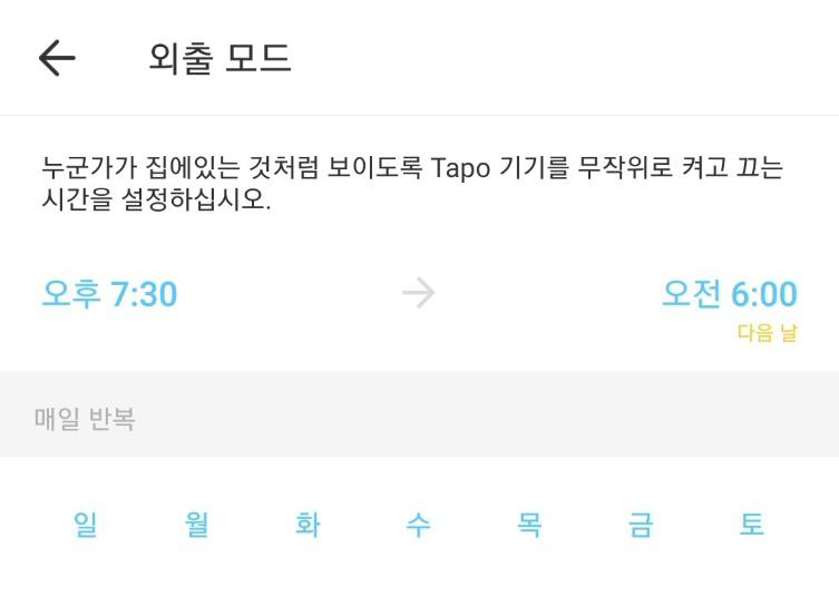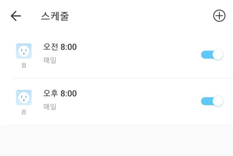 Tapo 앱 화면이다. 앱에서 전원 ON/OFF를 할 수 있고, 위 사진처럼 스케줄 등록도 가능하다. 아침 8시에 램프가 켜지고, 저녁 8시에 꺼질 수 있도록 해놓았다.
