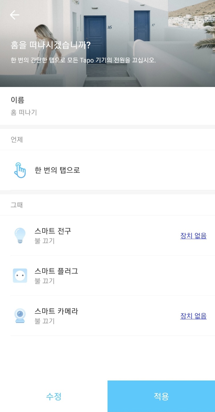 위처럼, 한 번에 끄고 켜는 액션을 도와주는 기능도 있다. 제품 하나씩 끄고 켜는게 아니라, 어떤 행동을 할 때 필요한 기능을 모아둔 것이다. 예를 들어 집을 나갈때 조명은 끄고 카메라는 켜는 등의 기능을 한번에 실행시켜준다.